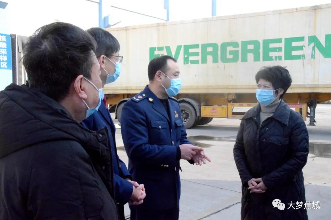 大夢蕉城(周思穎)1月29日下午,副區(qū)長石水鳳帶領(lǐng)區(qū)直有關(guān)部門一行赴城南鎮(zhèn)督查指導(dǎo)進(jìn)口冷鏈?zhǔn)称芬咔榉揽毓ぷ鳌?br/>