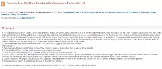 湛江國(guó)聯(lián)水產(chǎn)開發(fā)股份有限公司委托其美國(guó)分公司Sunnyvale Seafood,8月13日致信USTR,請(qǐng)求將進(jìn)口蝦類產(chǎn)品(HS:03061700、HS:16052110)從征稅列表中刪除。