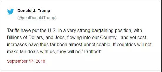 昨天(9月17日),美國(guó)總統(tǒng)特朗普宣布,將于9月24日起對(duì)約2,000億美元的中國(guó)產(chǎn)品加征關(guān)稅,稅率為10%,并將在2019年1月1日起上升至25%。白宮發(fā)布聲明宣布了這一決定,還稱如果中國(guó)針對(duì)美國(guó)農(nóng)民或其他行業(yè)采取報(bào)復(fù)措施,將會(huì)立即啟動(dòng)“第三階段”,對(duì)約2670億美元的中國(guó)產(chǎn)品加征關(guān)稅。
